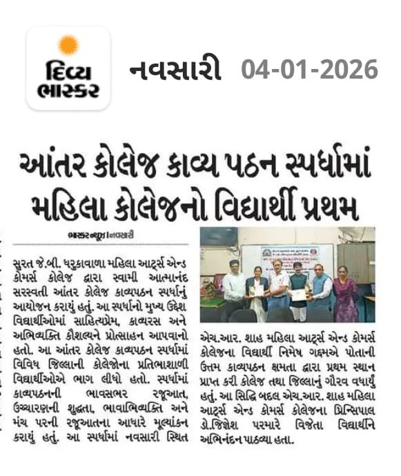 શ્રી જે.બી. ધરુકાવાળા મહિલા આર્ટ્સ એન્ડ કોમર્સ કોલેજ, સુરત દ્વારા શ્રી સ્વામી આત્માનંદ સરસ્વતી આંતર કોલેજ કાવ્યપઠન સ્પર્ધાનું ભવ્ય આયોજન કરવામાં આવ્યું હતું. કોલેજના વિદ્યાર્થી નિમેષ નરેશભાઈ ગદ્દમએ પોતાની ઉત્તમ કાવ્યપઠન ક્ષમતા દ્વારા પ્રથમ સ્થાન પ્રાપ્ત કરી કોલેજ તથા જિલ્લાનું ગૌરવ વધાર્યું હતું. તેમની આત્મવિશ્વાસપૂર્ણ અને ભાવસભર રજૂઆતને નિર્ણાયક મંડળ દ્વારા વિશેષ પ્રશંસા મળી હતી.