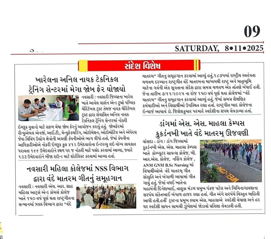 એચ. આર. શાહ મહિલા આર્ટ્સ એન્ડ કોમર્સ કોલેજ નવસારી ખાતે 1875માં રાષ્ટ્રીય સ્વતંત્રતા ચળવળ દરમિયાન રાષ્ટ્રગીત વંદે માતરમના માધ્યમથી રાષ્ટ્ર અને માતૃભૂમિ માટેના ગર્વની એક સૂત્રતાના સંદેશ દ્વારા સમગ્ર ચળવળ એક તાંતણે બંધાઈ હતી. જેના તારીખ 7/11/2025 ના રોજ 150 વર્ષ પૂર્ણ થતા રાષ્ટ્રગીતના સન્માનમાં NSS વિભાગ દ્વારા “વંદે માતરમ” ગીતનુ સમૂહગાન કરવામાં આવ્યું હતું. જેમાં કોલેજના સમગ્ર શૈક્ષણિક કર્મચારીઓ અને વિદ્યાર્થીઓએ હાજરી નોંધાવી હતી. રાષ્ટ્રગીત બાદ કોલેજના ઇન્ચાર્જ આચાર્ય ડૉ. જિજ્ઞેશકુમાર પરમારે સ્વદેશીના શપથ લેવડાવ્યા હતા જેમાં રોજિંદા જીવનમાં સ્વદેશી વસ્તુનો ઉપયોગ અને ગામ, ખેડૂત તથા કારીગરોનું સમર્થન કરી સ્થાનિક ઉદ્યોગોનો પ્રોત્સાહન આપવુ ભારતીય ભાષાનો ઉપયોગ અને પર્યાવરણ જાગૃતિ જેવા વિવિધ મુદ્દાઓનો સમાવેશ કરવામાં આવ્યો હતો . સમગ્ર સ્ટાફના સહયોગથી કાર્યક્રમ સફળતાપૂર્વક સંપન્ન થયો.