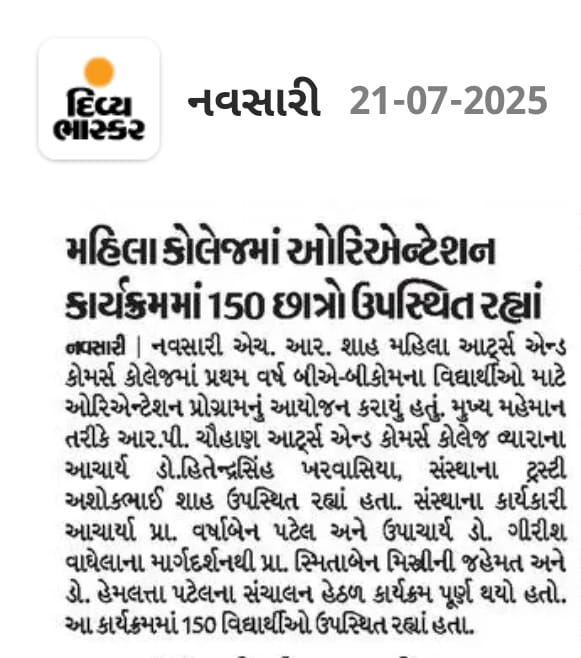 Orieantation program was held on 19/7/2025 for new admission first year students . The program was honoured with our institution trustree Shri. Ashok Shah Sir and as a chief guest we had Dr. Hitendrasinh Kharwasia, principal sir of R. P. Chauhan Arts and Commerce college, Vyara. The program was coordinated by Dr. Smeeta Mistry, under the able guidance of Principal Mrs. Varsha Patel and Vice Principal Dr. Girish Vaghela. Nearly 150 students were present. The students were welcomed with sweet and pen.